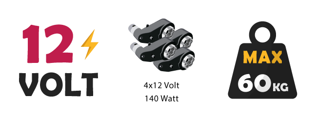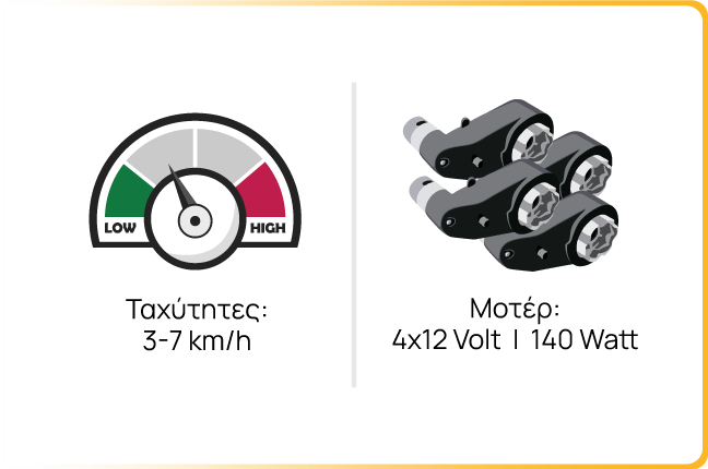 Το όχημα φέρει τέσσερα μοτέρ με ισχύ 35 Watt έκαστο (140 Watt συνολικά), ενώ οι ταχύτητες που αποδίδει είναι μεταξύ 3-7 km/h.